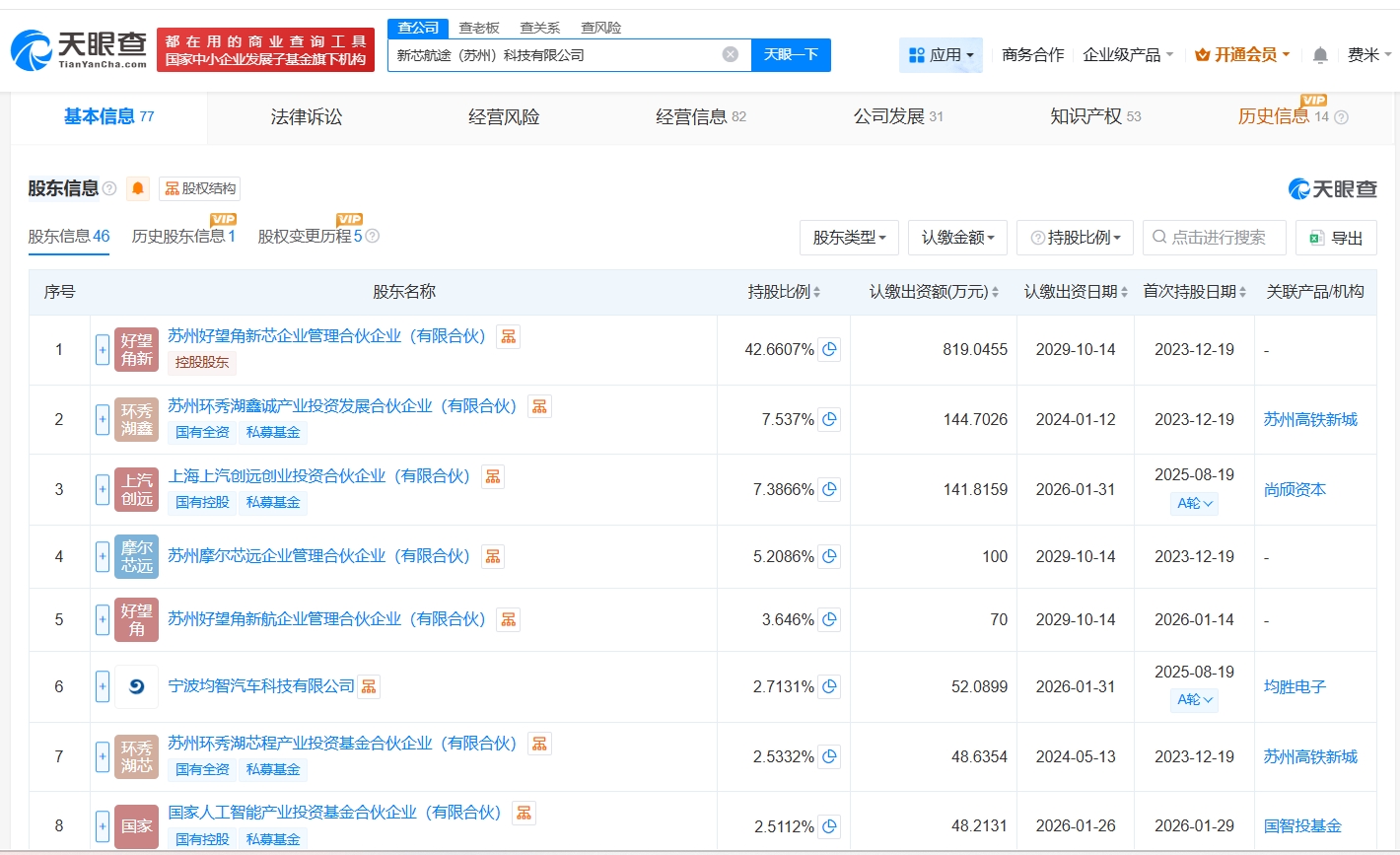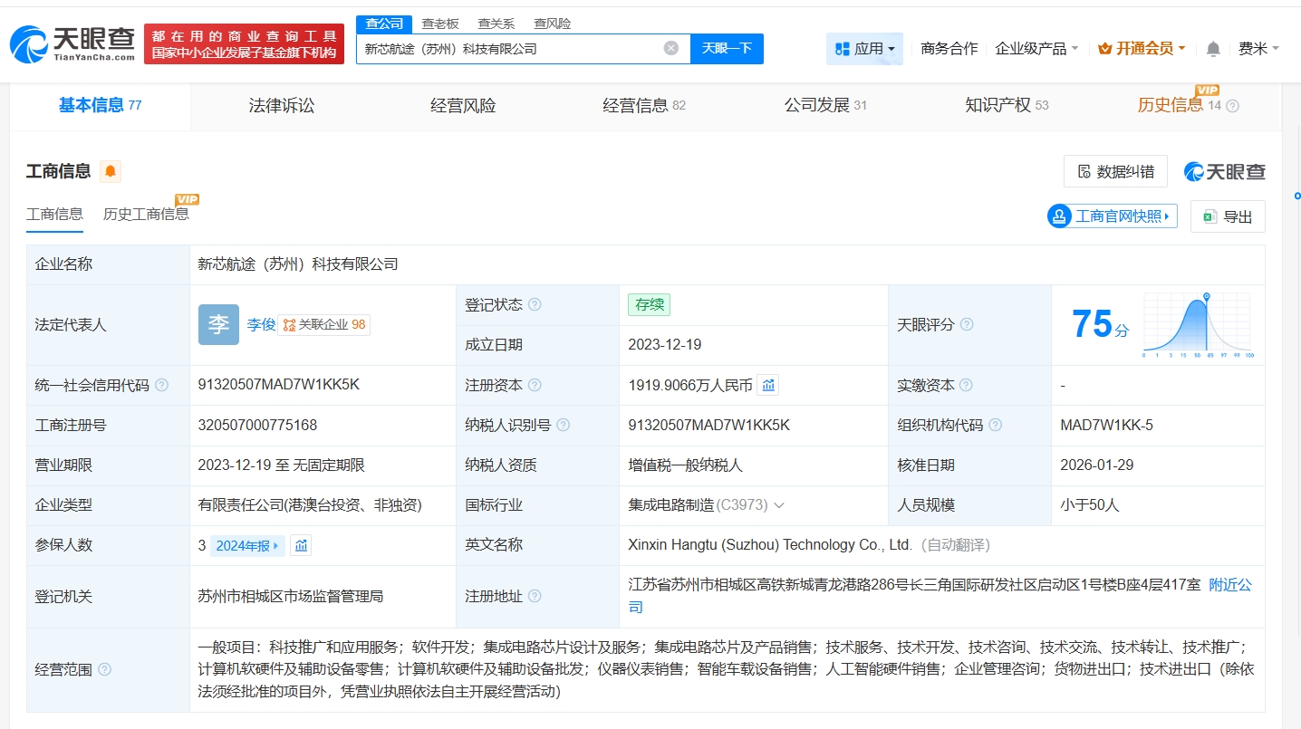 新芯航途(苏州)科技有限公司成立于2023年12月,法定代表人为李俊,经营范围包括科技推广和应用服务、软件开发、集成电路芯片设计及服务、集成电路芯片及产品销售等。股东信息显示,该公司现由苏州好望角新芯企业管理合伙企业(有限合伙)、上海上汽创远创业投资合伙企业(有限合伙)及上述新增股东等共同持股。公开信息显示,该公司是一家集成电路芯片设计与自动驾驶技术研发商,其自主研发的芯片瞄准20-30万车型市场,计划对标行业主流产品。