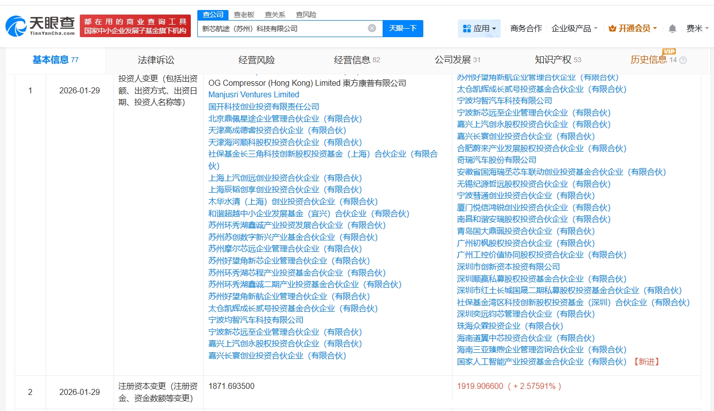 雷达财经讯,天眼查App显示,近日,新芯航途(苏州)科技有限公司发生工商变更,新增国家人工智能产业投资基金合伙企业(有限合伙)为股东,同时,注册资本由约1871.7万人民币增至约1919.9万人民币。