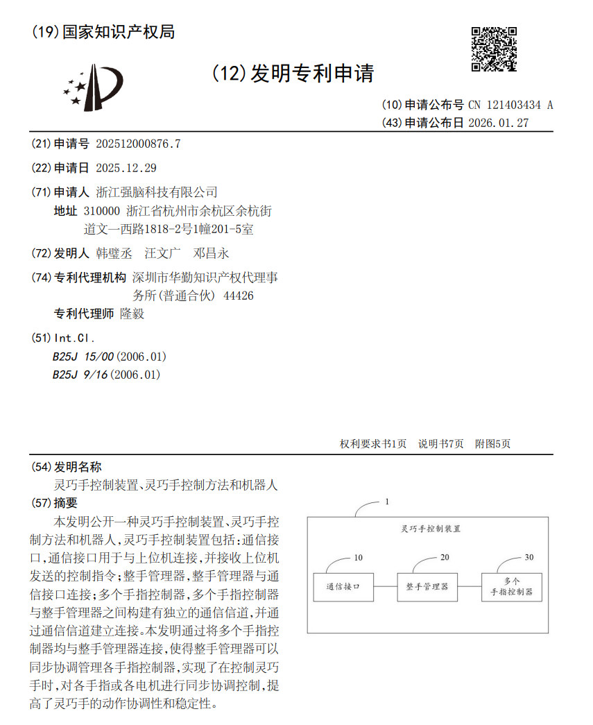 企查查APP显示,近日,浙江强脑科技有限公司申请公布“灵巧手控制装置、灵巧手控制方法和机器人”专利。